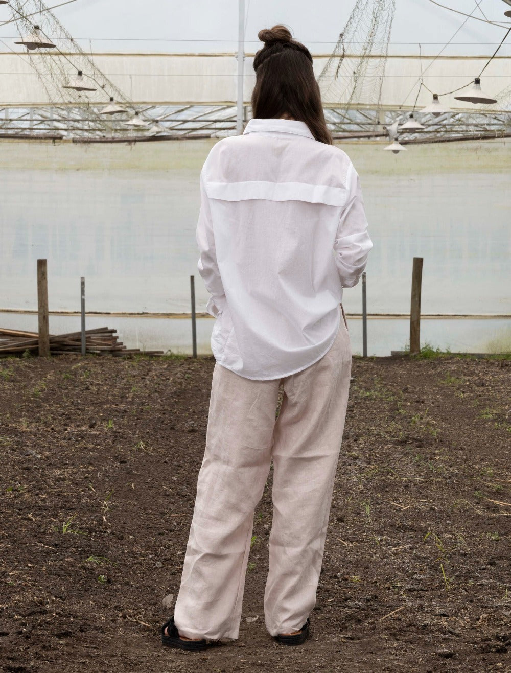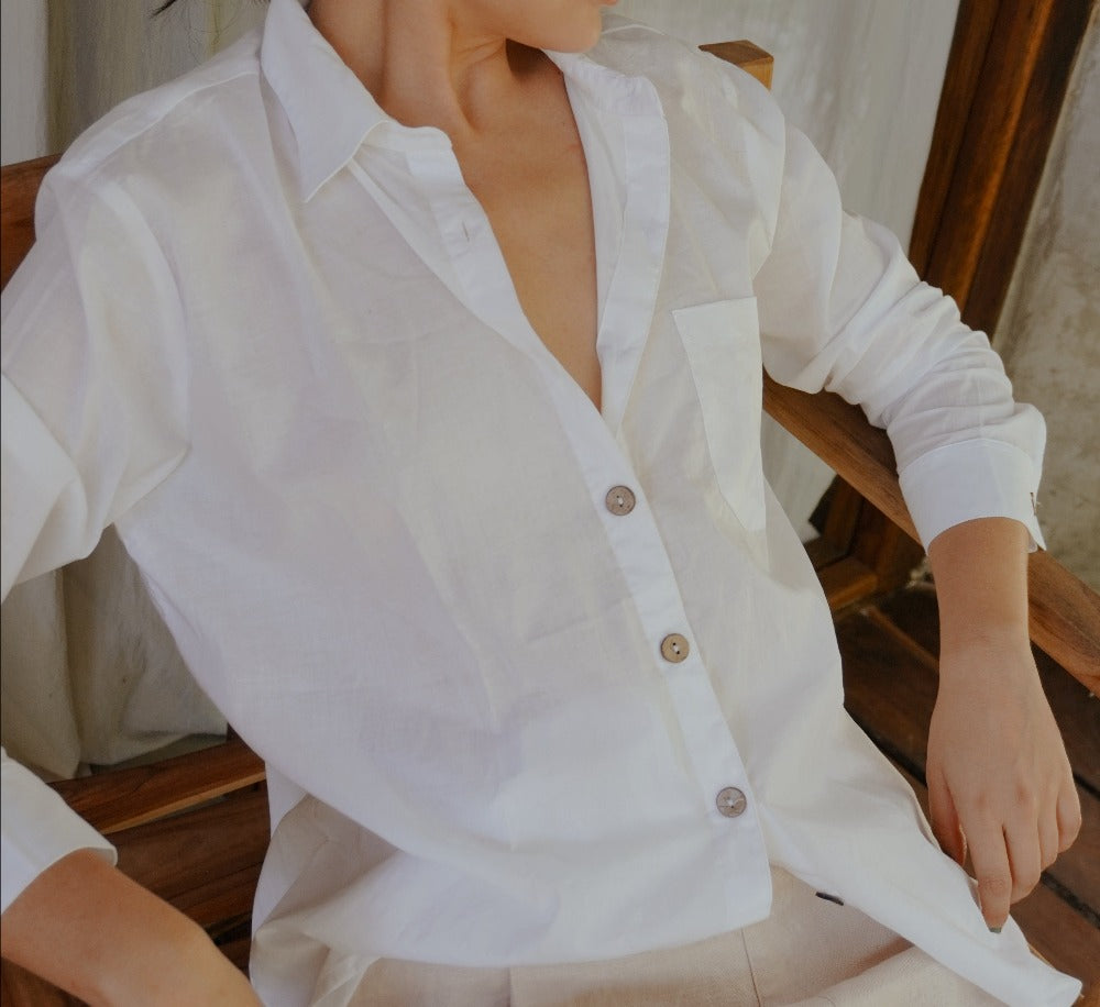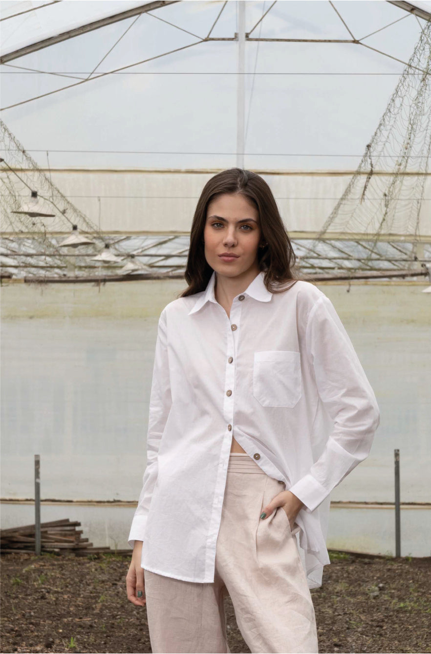 Esta camisa, es confeccionada con un tejido 100% algodón, presenta una amplia almilla y un estilo oversized que te brinda comodidad y estilo. Su cuello solapa y manga larga añaden un toque clásico y versátil, mientras que el bolsillo frontal y el cierre con botones de coco le otorgan un encanto único. Esta camisa es perfecta para cualquier ocasión. Combínala con pantalones o faldas para un look profesional o sobre una crop top y unos shorts para un estilo más relajado.