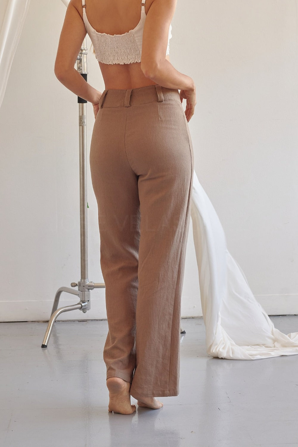 Pantalón de tiro alto con alforzas delanteras. Bolsillos frontales. Cierre frontal con cremallera y gancho metálico. Es perfecto para los outfits de tu día a día.