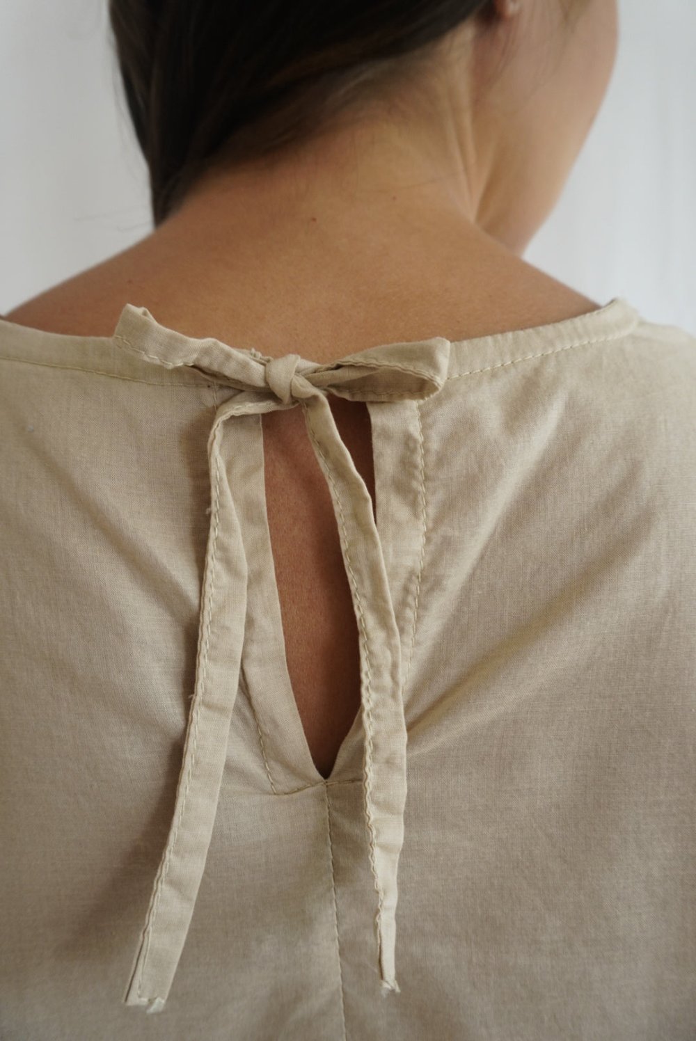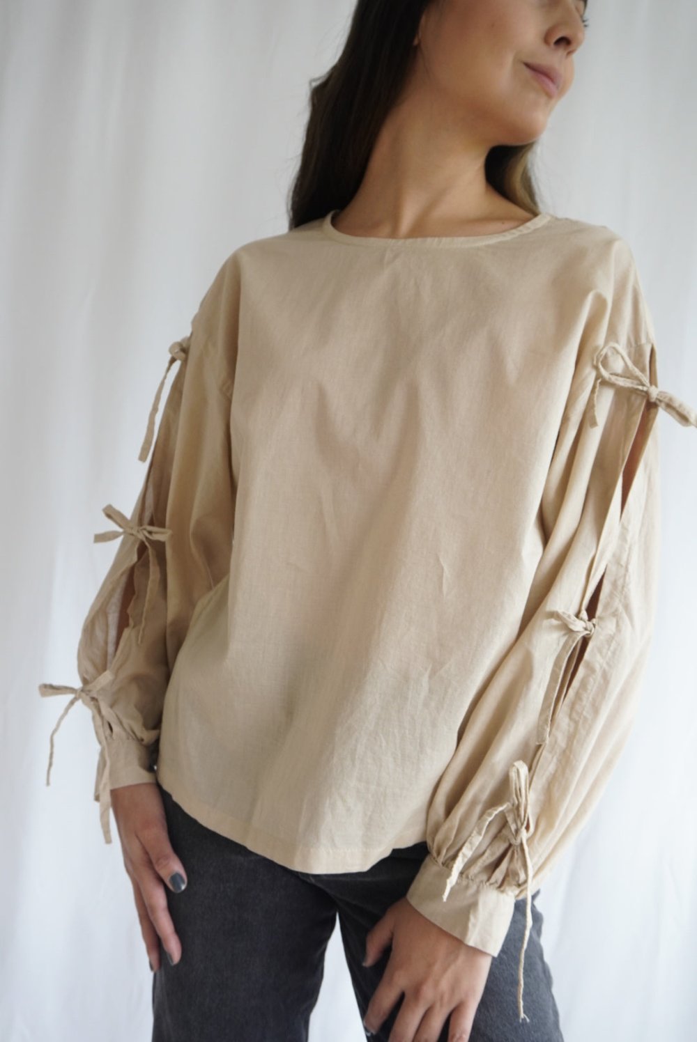 Top de cuello redondo, con ajuste en la parte posterior. Sus mangas cuentan con delicadas tiras para atar, añadiendo un toque de estilo único. Ideal para cualquier ocasión, este top combina comodidad y sofisticación en una sola prenda.
