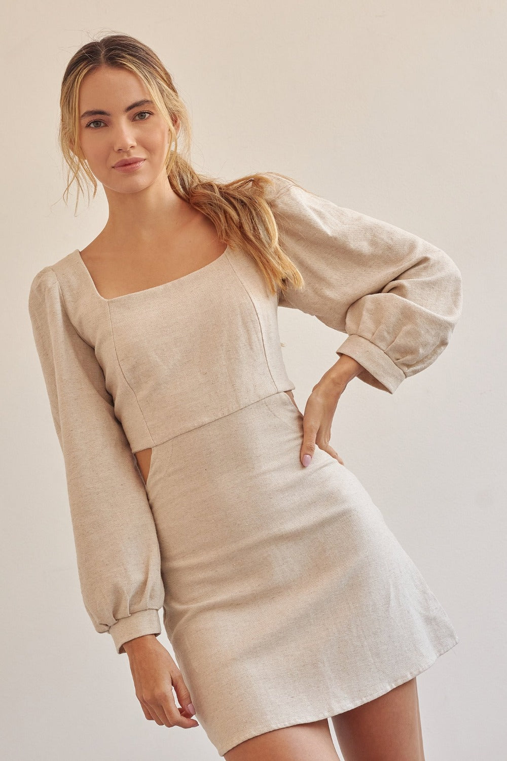 Vestido corto de escote cuadrado y manga larga abombada. Bolsillos laterales. Espalda descubierta y costados. Cierres laterales con cremallera oculta en costura.