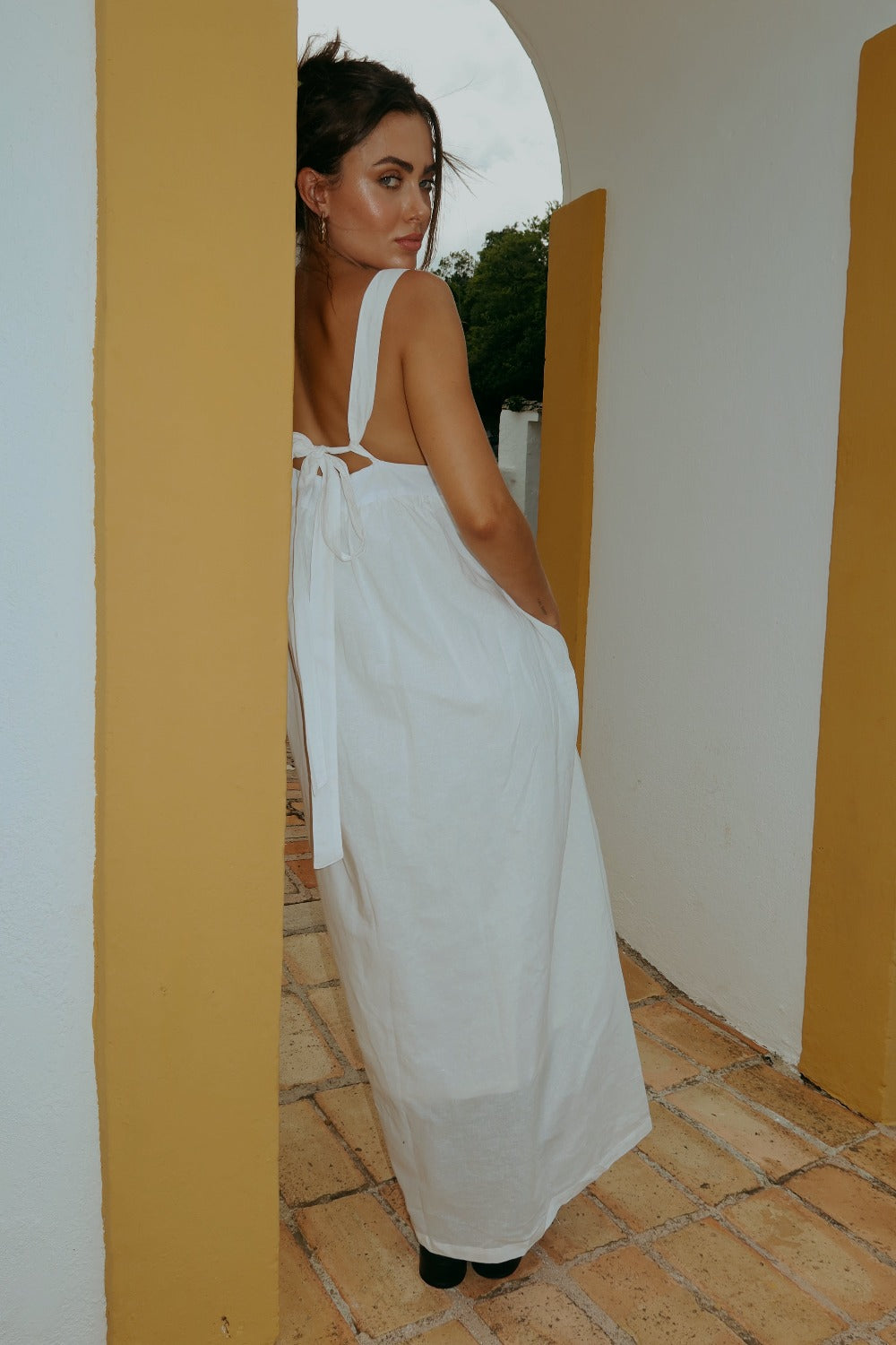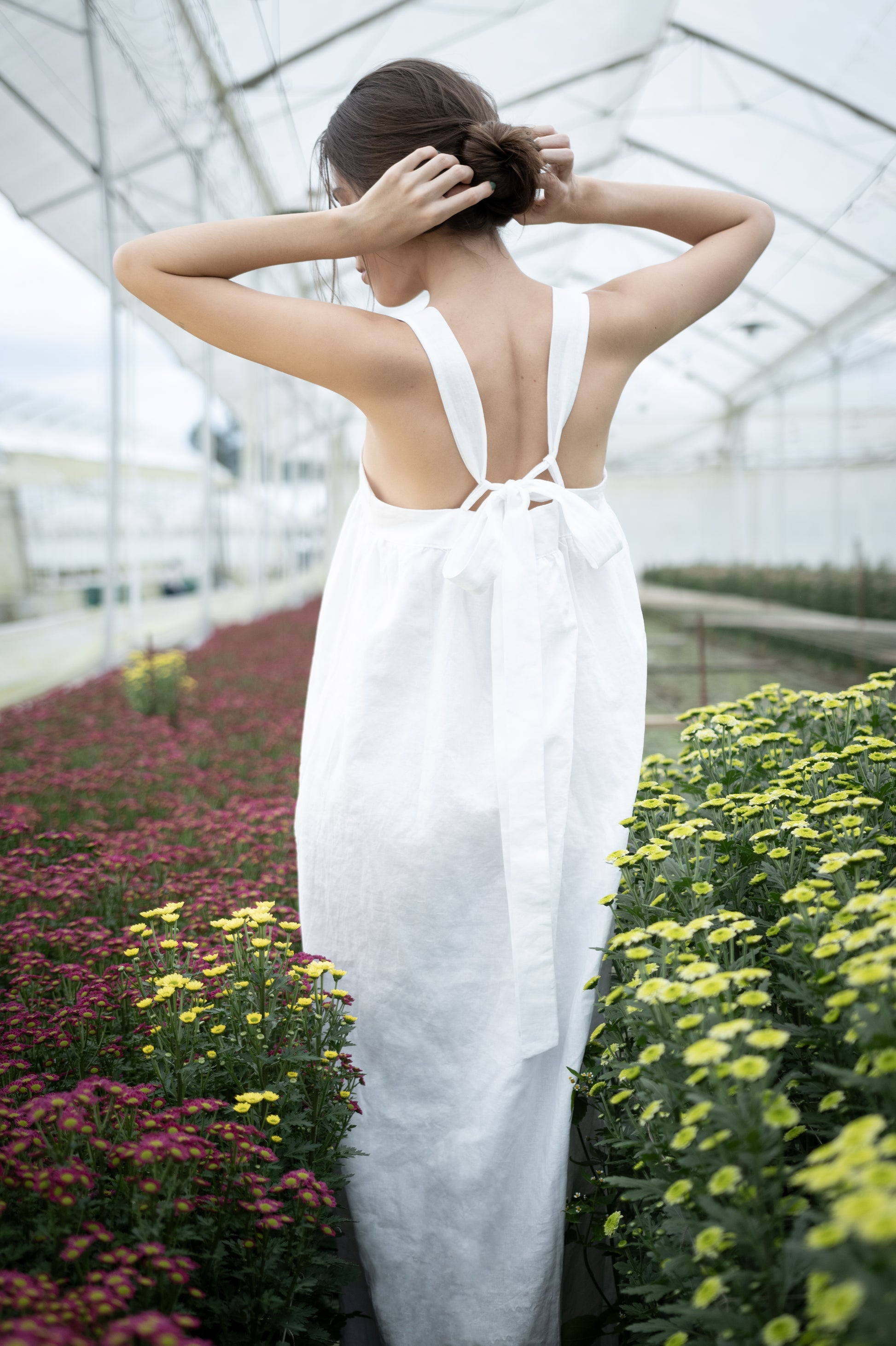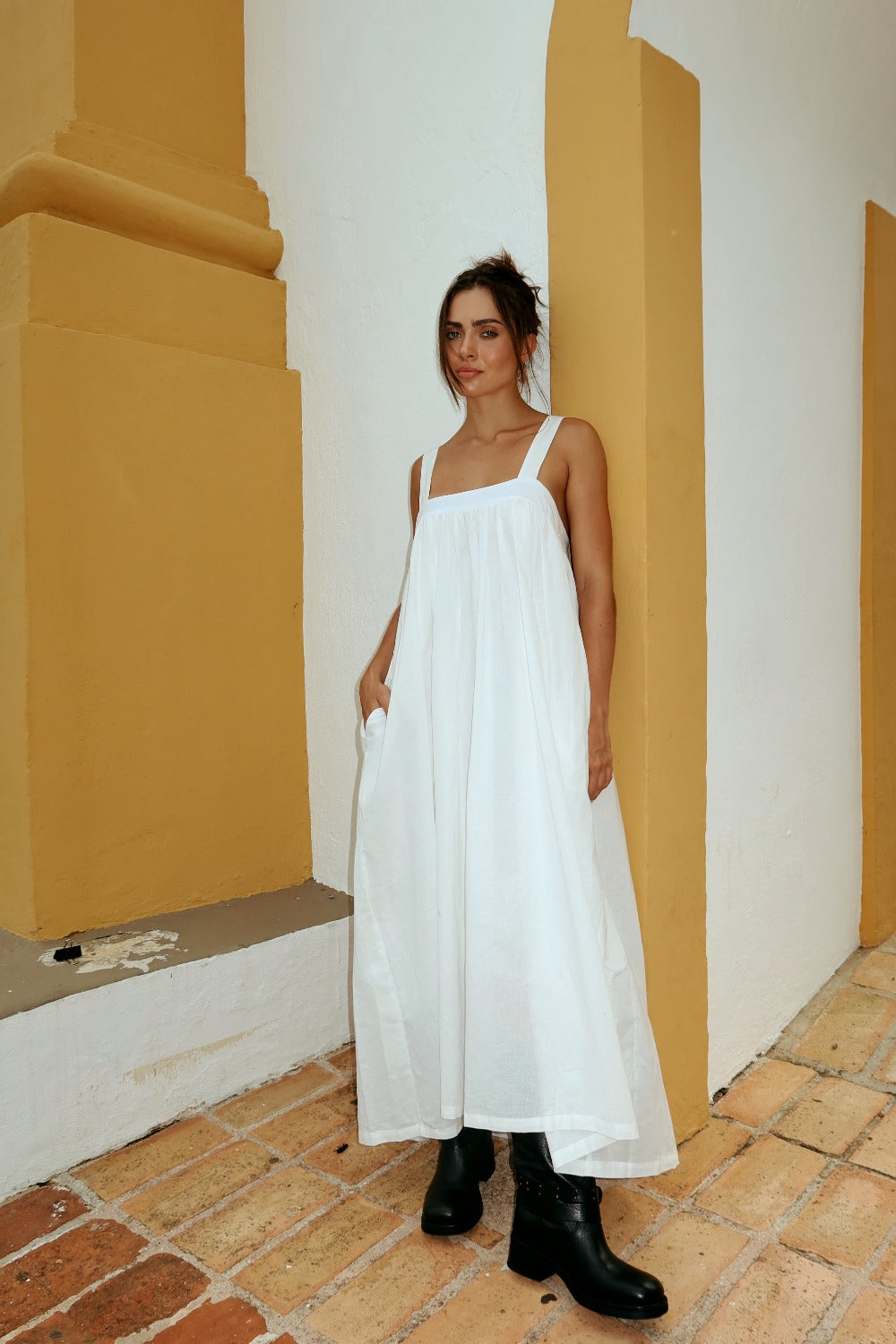 Vestido midi hecho de una mezcla de algodón y ramio Escote recto y tirantes anchos ajustables en la parte posterior. Bolsillos laterales en la costura.
