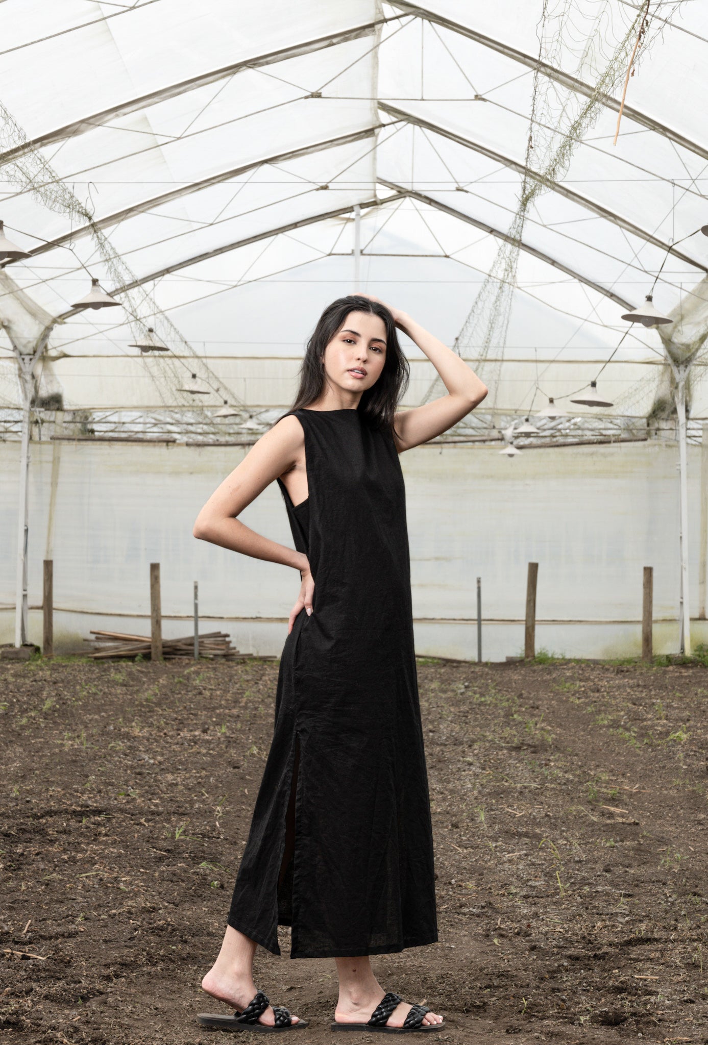 Vestido midi con corte en los laterales y detalle de aberturas laterales.